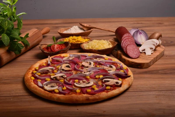 Frischer Teig, Tomatensauce, echter Käse, Salami(Pute), Zwiebeln, Mais, frische Champignons