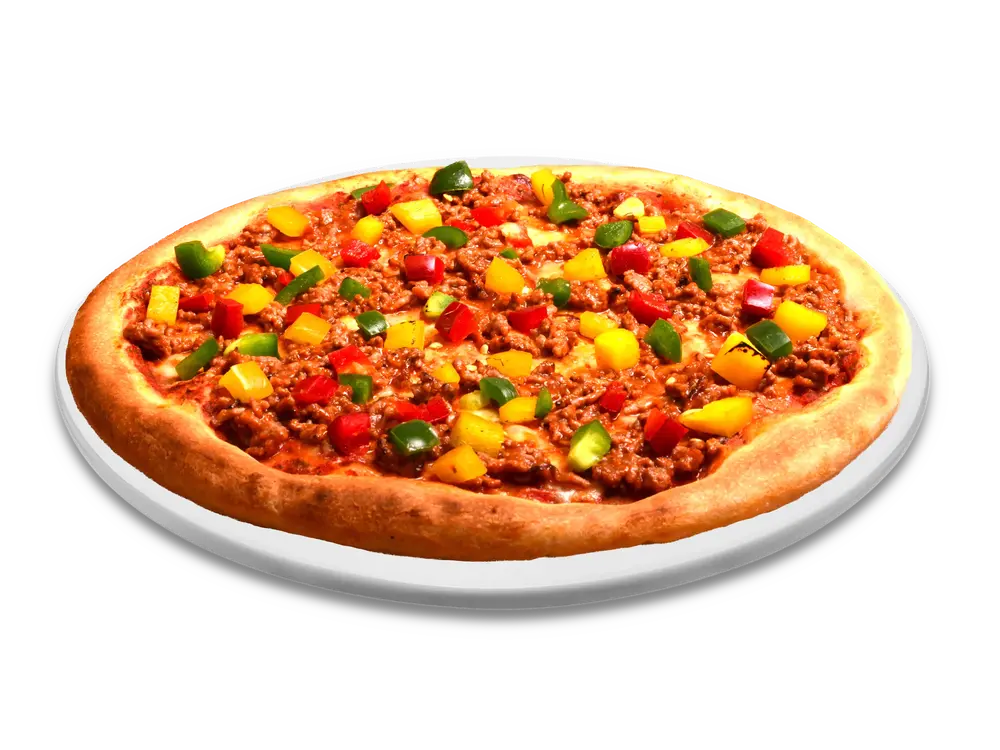 Frischer Teig, Tomatensauce, echter Käse, Hackfleisch(Rind), Paprika, Chili